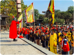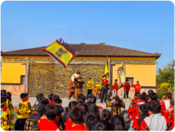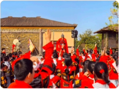下午的“沙场点兵”仪式将氛围推向高潮。五个班师生齐聚周瑜大帐前草坪,随着场景还原,“吴国军队”整装待发。“大将军周瑜”着古装登点将台检阅,浓厚的仪式感与生动的角色扮演,让同学们仿若穿越千年,置身古战场,深刻感受军队纪律与气势,对三国文化的认知更进一层。